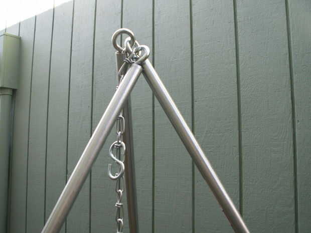 Los ejes de los pernos de ojo en los extremos de las patas y soporte para arriba con las piernas equidistantes, como se verá en una fogata. Poner uno de los ganchos de S de la cadena en la parte superior y utilizar las pinzas para cerrar firmemente. Este será el Ajustador de la altura de la olla.
