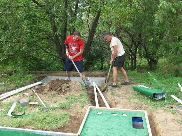 Con una pistola de calafateo, poner adhesivo de interior/al aire libre sobre la cubierta de los cursos. Use una llana que tiene ranuras en que extienda el adhesivo sobre la cubierta. Cortar la alfombra a la medida antes de poner el pegamento! Después de pegar, poner la alfombra en la cubierta. Utilice un rodillo para asegurarse de que la alfombra es plana y presionado sobre la cubierta encolada. No tenemos un rodillo, así que uno de 4 pies de 4 pulgadas de diámetro PVC y relleno con concreto y deje que se endurezca. Después de 24 horas, usted puede cortar cuidadosamente los agujeros de la alfombra. Una vez que haya terminado de poner en la alfombra, uñas tratada a presión 2 x 6s alrededor del perímetro de cada curso para que la bola permanece en juego y puede Banco los tiros.