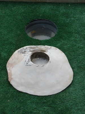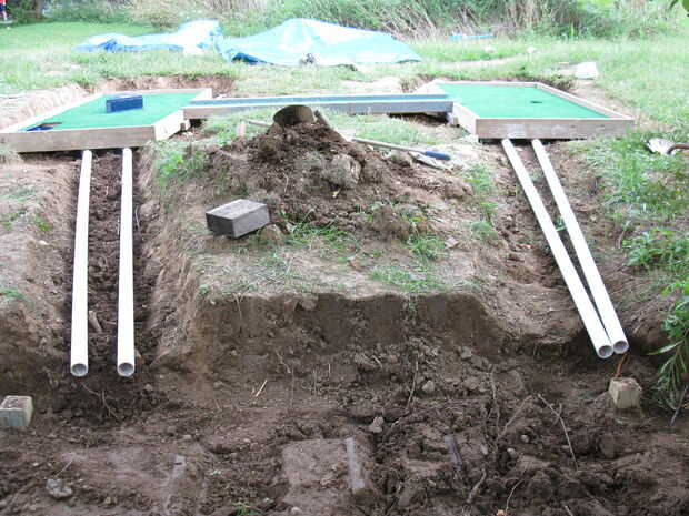 Si tienes una diapositiva u otro medio para conectar múltiples cursos juntos, hacerlo ahora.  También pusimos una madera tratada a presión 2 x 6 alrededor del perímetro de los cursos para que pudiéramos tener una manera de mantener la bola dejando el curso y para tiros de banca.  Use su imaginación para crear obstáculos.  Nuestro curso es béisbol (Cleveland Indians - vaya tribu) basado.  Cualquier obstáculos que crean, cortar un círculo de diámetro de 4 pulgadas de madera contrachapada de 3/4 de pulgada y se adhieren a la parte inferior de su obstáculo.  Así puede insertar el obstáculo en los agujeros de PVC de 4 pulgadas de diámetro y moverlos a voluntad. Entonces disfrute de muchas horas de jugar golf en miniatura!