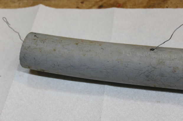 Un trozo de alambre de mecánica a través del agujero y el extremo del hilo de rosca. (cualquier alambre o cuerdas podrían utilizarse siempre y cuando sea lo suficientemente flexible como para ir a través del orificio y el final) La longitud del alambre es dos veces la longitud de la tubería, (el mío es 32 pulgadas)