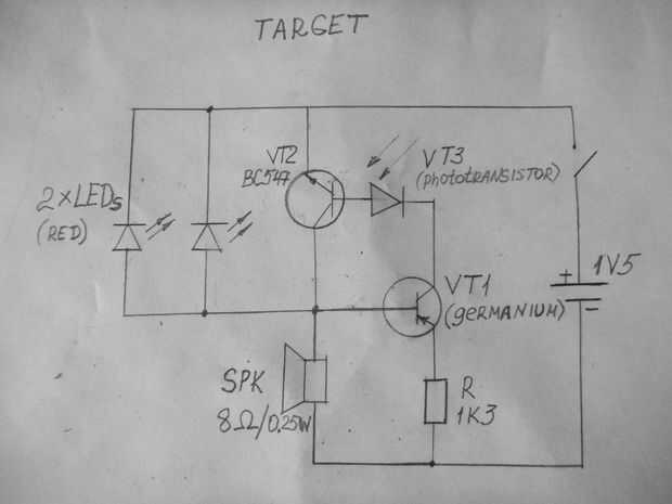 El esquema es un oscilador de RL modificado. He añadido 2 LEDs y un phototransistior. Nota: es importante utilizar LEDs con el voltaje de funcionamiento más baja (debajo de 2V). No puede sustituir un transistor de germanio con un silicio uno.