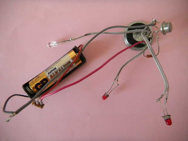 No es necesario un PCB. Transistores, un resistor y los alambres para cables de salida del altavoz de la soldadura. Cuando haya terminado, el objetivo de la prueba. Tan pronto como usted expone el fototransistor a la luz de los LEDs será en y el altavoz empieza a sonar.