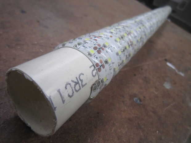Inserte los cables en el pequeño agujero y empezar a enrollar el LED en el trabajo final que ha perforado de PVC, el rollo completo de 5 m debe terminar unos 300 mm de PVC. Una vez que un lazo alrededor del PVC es fácil de mantener tope contra el bucle anterior, trate de no tocar el forro adhesivo en el LED después de que despegue el papel ya que esto reduce su stickability :)