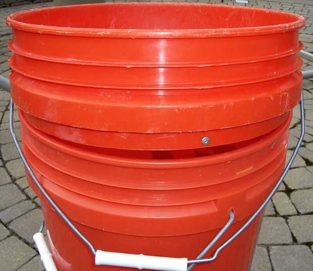 1. Corte la parte del borde superior de un tercer cubo. El corte debe ser aproximadamente 3/4 de pulgada por debajo de la brida del pasado en el cubo. Al corte, la parte superior quitada de la forma de un cubo la cuenca del costado.
