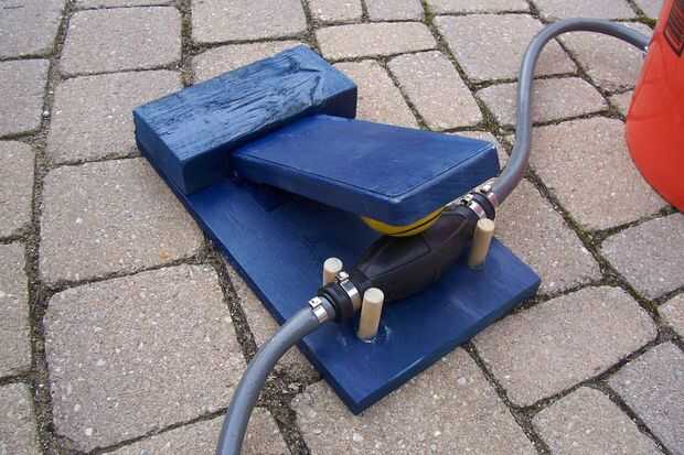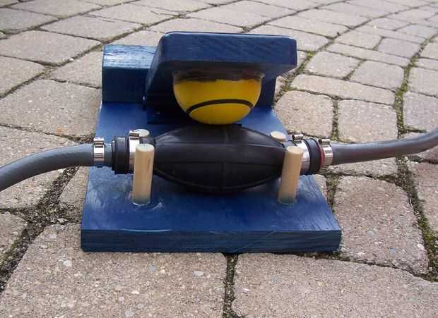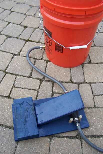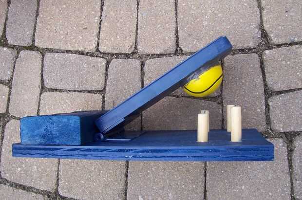 La Asamblea de pedal fue hecha de madera, una bisagra de puerta, clavijas de madera y una pelota de juguete de goma espuma.