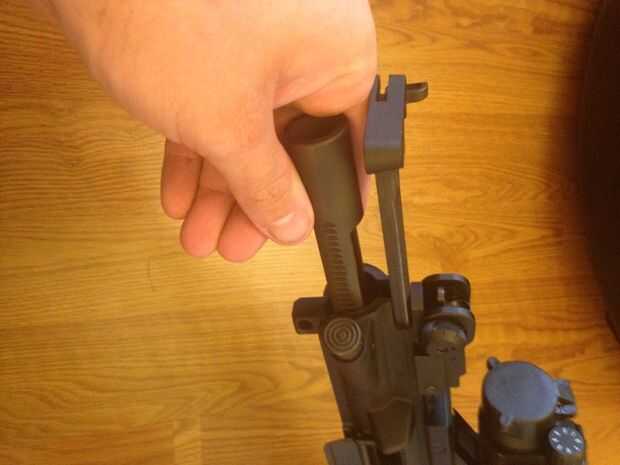 Apartar el recibidor inferior. Sosteniendo el receptor superior, agarre la palanca de carga y tire de él hacia atrás. Después de hacer esto, se expondrá la parte trasera del grupo del portador del perno. Agarre el área expuesta y tire de ella hacia atrás en un ángulo hacia abajo. Esto hará que el grupo del portador del perno todo salir del Recibidor superior. Dejar de lado el grupo del portador del perno. Mientras que la palanca de carga todavía en la parte trasera, presione hacia abajo en la parte superior hacer estallar hacia fuera. Después de este paso, el Recibidor superior ahora se desnuda completamente. El siguiente paso es desmontar el grupo del portador del perno.