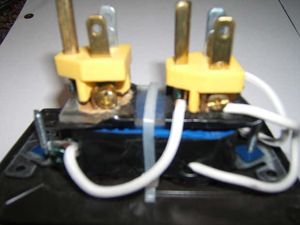 Por lo tanto, lo primero que vas a querer hacer es cubrir la parte trasera del soporte del tapón con cinta aislante para aislarlo. Luego, alinee el soporte en la parte posterior de la toma de corriente y utilice el lazo de plástico de extracción para mantener en su lugar. De esta manera, si fueras a enchufe en una toma justo después (¡ no!) se alimenta ambos tapones, pero al mismo tiempo ver como si una toma se enfrentaban (ver fotos).