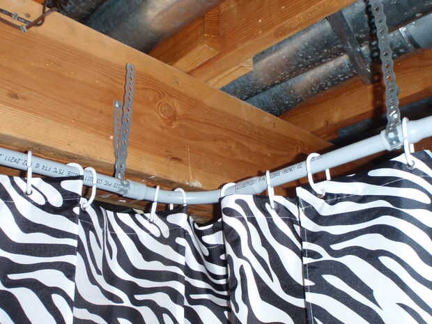 Utilice a uniones angulares en las esquinas y hacer la forma de la pared para adaptarse a su sótano. Cuelgue cortinas de ducha baratas y se disfrazan.