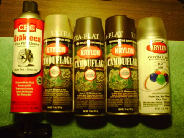 Siguiente arreglé mis materiales... Elegir piezas de frenos limpiador porque tiras absolutamente todos goo de cualquier metal y seca bastante rápido; Camo ultraplano Krylon pintura porque es básicamente el más duro sh * t en una lata; Capa de acrílico, plano claro para durabiliy extra y super bajo brillo. Elija sus colores asumiendo su entorno del AO y permanecer lejos de negro... rara vez ocurre en la naturaleza y es muy fácil observar. Ya que quería un patrón de ruptura del bosque, elegí color caqui para mi base, marrón, verde oscuro y 2 capa por capa de follaje 3.