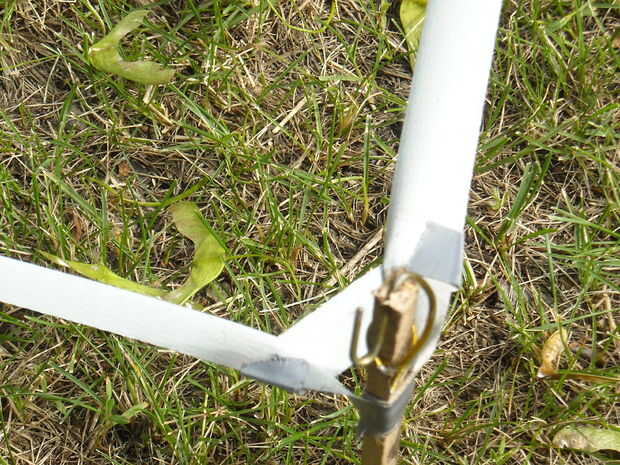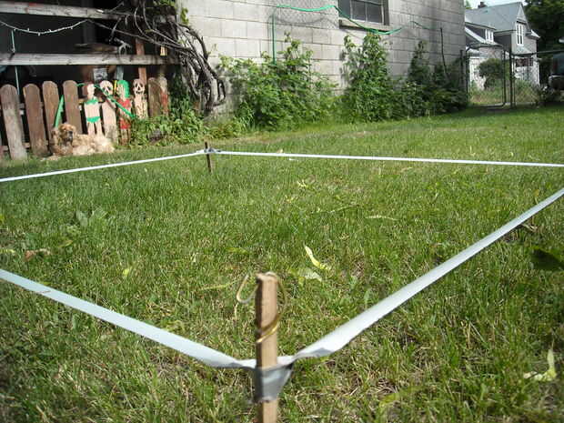 Un filete de martillo en el suelo para cada esquina de su red de aproximadamente 1" de tierra de thr. Esto haría un poco más fácil trabajar con y que debria no se pegue a la cinta. En cada esquina, coloque una tira de cinta como se muestra para permitir que la cinta en posición plana. (lado pegajoso hacia arriba)