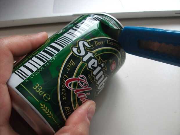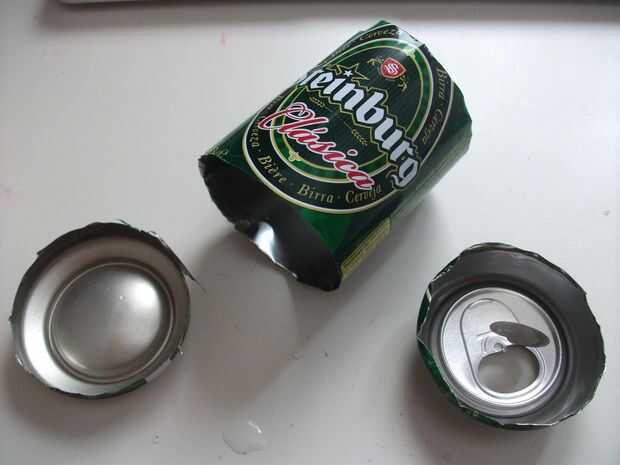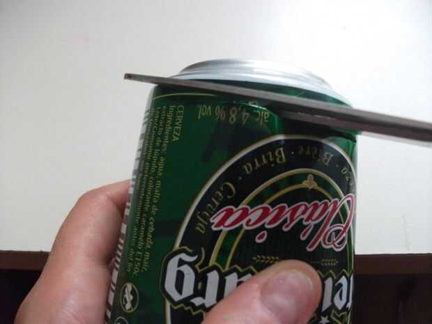 Tomar el poder. Hacer un agujero en él con un cutter o algo fuerte. Introducir las tijeras a través de ese agujero para cortar ambos extremos de la lata. Vas a utilizar las dos piezas resultantes para hacer el sostenedor de vela.