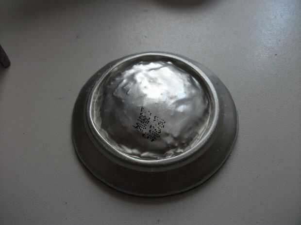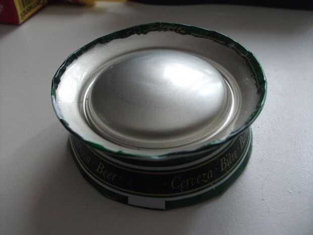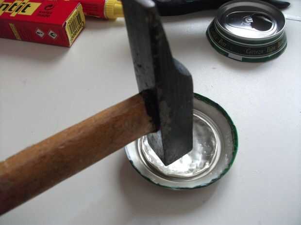 Tomar la parte inferior de la lata y golpeó con un martillo para invertir la sección redonda del medio.