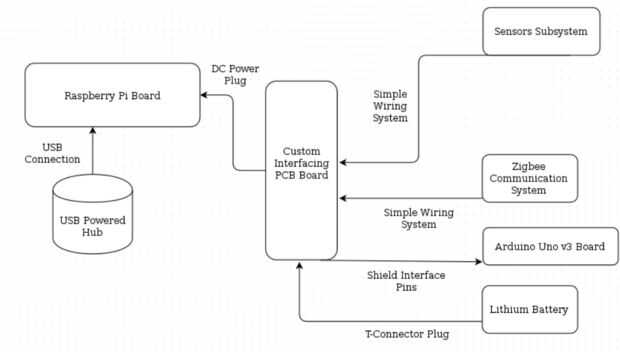 Cuando empezamos el proyecto, hemos querido seguir con la famosa declaración (mantenerlo siempre simple). Así que empezamos con el principal cerebro artificial del sistema, el Raspberry Pi, conectados las tres cámaras junto con el módem del USB 3,5 G, conectados en el Hub USB alimentado por y había conectado a una de las entradas USB de la placa Pi. Después de eso, conectamos los sensores y subsistemas de comunicación Zigbee de la placa Arduino. Por el bien de simpliness, hemos diseñado una placa PCB personalizado que tenía un mejor sensores-así como la batería de alimentación interfaz de enchufes. como se muestra un diagrama de bloques simple que explica la arquitectura hardware utilizada en CanSat II.