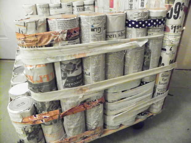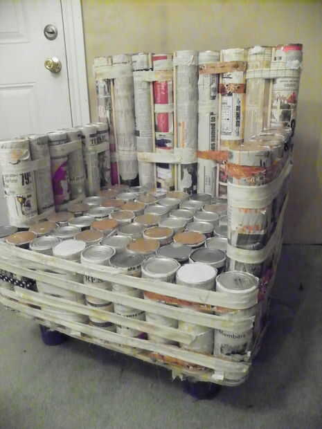 Los brazos de la silla alta 4 latas y hay 6 columnas en cada brazo. Corte una hoja vieja en tiras y envuelto estos alrededor de la base de la silla y caliente pegado en lugar. Este paso ayuda a mantener todo unido. en las esquinas delanteras hay 2 latas cada uno.  Esto se coloca directamente frente a los brazos de la silla. Pegue las tiras de tela alrededor de las latas para mantenerlos todos juntos.