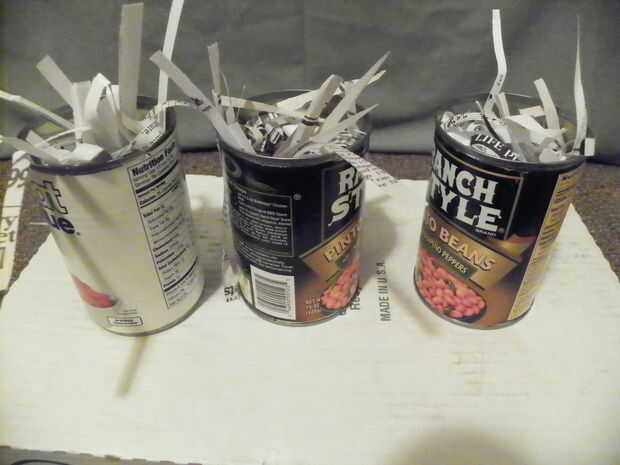poner papel picado en las latas limpias, presionando hacia abajo y añadir más hasta que usted no puede conseguir ningún papel más en el poder. Este paso hace que el robusto sólido y muy de latas. Coloque un círculo de cartón sobre la lata después de llenarlo con papel picado. Cinta hacia abajo y dejar de lado. Repita con las otras latas.