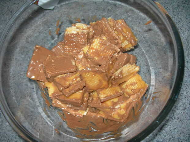 Durante unos 30 segundos, remover, luego otro de 30 segundos... seguir adelante hasta que el chocolate se ha derretido de las obleas.