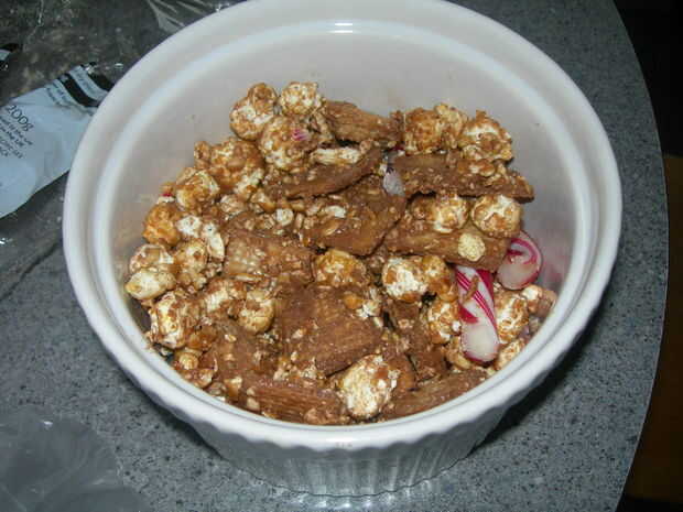 Vale. Añadir las palomitas de maíz a la mezcla.