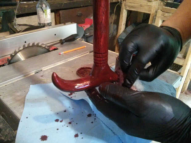 El colorante que utilicé fue un acondicionador rojo Cabernet que aplicado en dos capas, limpiadas, con 30 minutos programar tiempo en medio. Realmente quería ver ese grano de madera agradable así que limpiándola era la elección obvia. Puesto que el arce y el cerezo son dos tipos diferentes de madera, la cereza terminó, algo, más oscuro, que para mí resultó para ser un resultado fantástico.