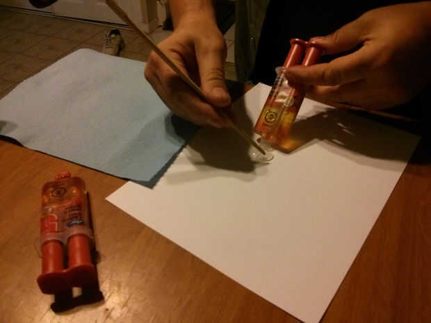 Es importante trabajar rápidamente al utilizar resina epoxi, a pesar de que establece en 5 minutos, ¡ empieza a hortera en 3 y empezar a grupo si seguir trabajando con él. Recomiendo, para la primera capa, hacerlo en secciones delgadas y luego usando la segunda capa para mezclarlos todos juntos. Debe dejar un acabado agradable, suave y cristalino.
