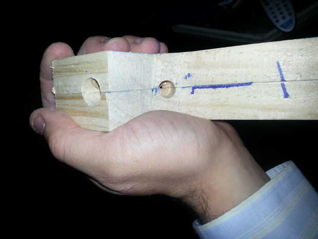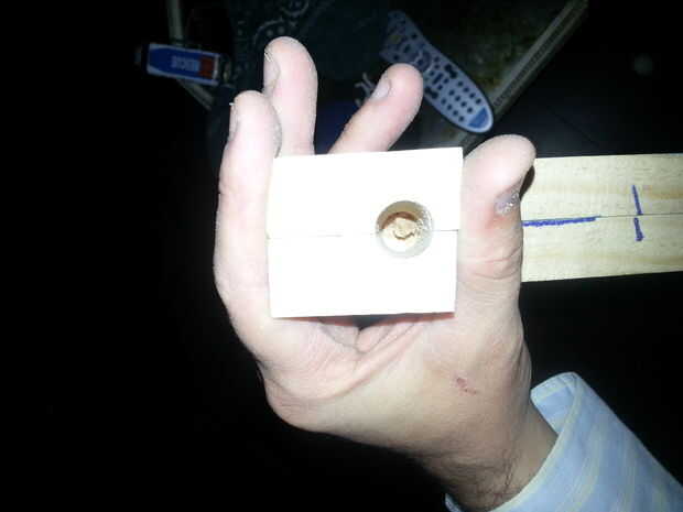 Después de que las piezas se alinean coloqué el phaser / caña mango en mi mordaza de mesa.  Luego perforé un agujero de 5/8 de pulgada para la caña y un orificio de 7/16 para el gatillo.  Una prensa del taladro sería lo mejor, lo hice mano libre pero los mejores resultados se recomienda una prensa del taladro.