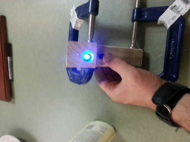 El siguiente paso es pegar las 2 mitades de la phaser.  Usé pegamento de madera y colocado en C 3 mordazas y dejar secar 24 horas antes de continuar a trabajar en el proyecto.
