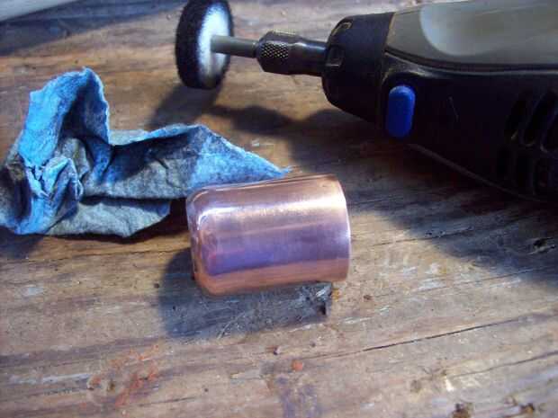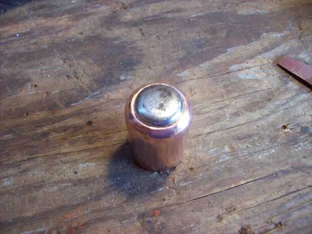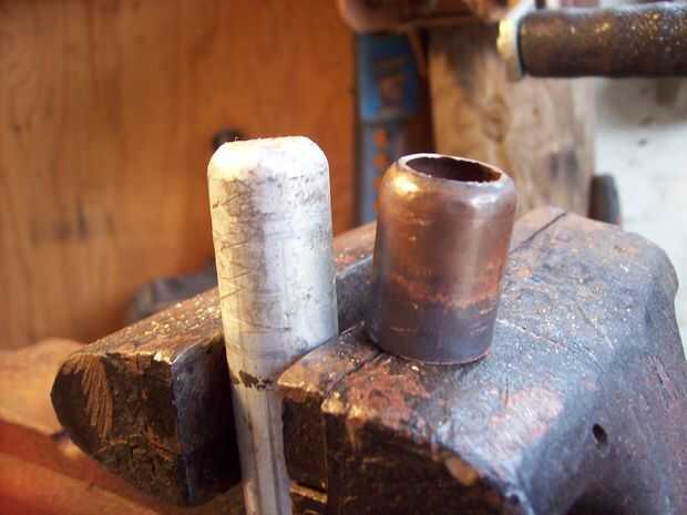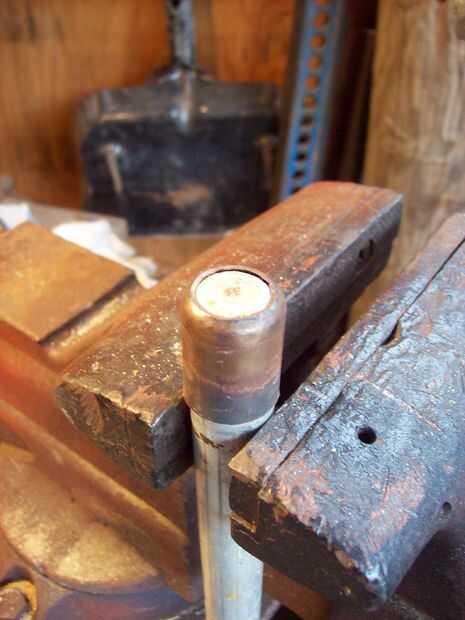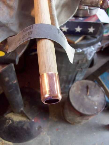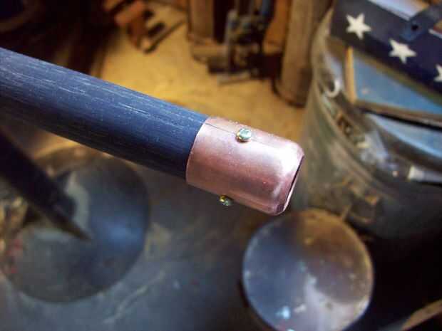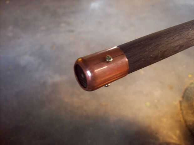 mantuve la virola muy sencillo en estilo, pero con este diseño, se puede obtener lujo si te gusta por diseños de corte en el cobre. De todas formas, comencé con una longitud de cobre de 3/4" tubo que era aproximadamente 1 1/2 a 1 3/4" de largo (arbitraria). Usando un paño de esmeril, lija el extremo de la caña hacia abajo hasta el tubo de ajuste perfectamente sobre él. Por encima de la virola, afilado del eje hasta todo el espesor; Aparte de eso, el eje es completamente recto. La última cosa que hice al eje fue cantos sobre para que coincida con el redondeo de la virola de cobre que describiré a continuación. Una vez que el tubo era áspero equipado, tomé un pedazo de la acción que caben dentro de la tubería y tierra un perfil redondeado en un extremo para usar como una forma para el casquillo de la barra. Con la barra de acciones sujetada en una prensa, colocar el tubo sobre ella. Con un soplete de propano calienta el cobre y, mi camino alrededor borde, había redondeado al final por golpearlo con un martillo de bola pequeña. Después de que el cobre había refrescado, presentó el orificio final en la férula para que coincida con el diámetro de la tachuela de castor. Para colocar la contera, taladré orificios pequeños en 120 grados alrededor del tubo de cobre, también taladrados previamente los agujeros en la madera una vez tuve la férula colocada donde yo quería. La bordada de ricino fue conducida en un orificio previamente taladrado (si) en el extremo de la caña. Debo mencionar que la razón por la que presenté el orificio en el cobre férula para que coincida con la tachuela de ricino era para que si alguna vez fueron dañados el manguito de cobre o solo quería cambiar, no tendría que tirar la rueda tack así. Una desventaja de la tachuela de ricino es que no agarre muy bien en superficies resbaladizas, por lo que sólo puede utilizar un pedazo grueso de goma ajustaron o virado en su lugar.