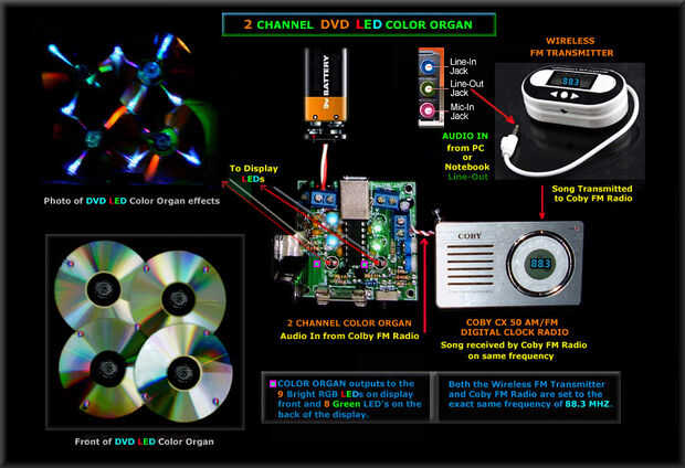 La idea era transferir música de mi computadora - utilizando un transmisor de FM , un pequeño receptor de FM conectado a un órgano de Color LED – y finalmente a montar todo esto en un "muro pantalla" - (con preferiblemente sin cables que muestra).
