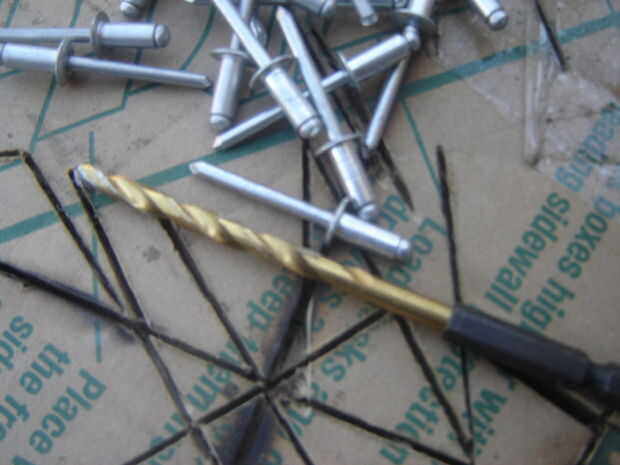 Las herramientas que utiliza son un martillo, herramienta de remache y remaches, un taladro y varios pedacitos de taladro, las abrazaderas en C, una amoladora angular con una rueda de corte, cinta y un marcador permanente.