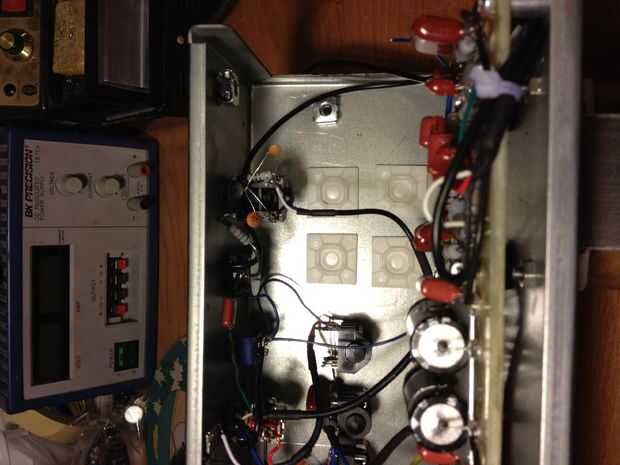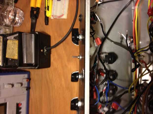 Momento de comenzar el cableado del interruptor de palanca. Tierra va a ir a cualquier lado del interruptor se cierra cuando está en la posición que desee para ultra seleccionado por este interruptor. A menudo es la clavija del medio en estos interruptores, pero ese no es el caso aquí, así que preste atención al esquema. Usted puede tomar el largo de la toma de entrada de placa de circuito del amplificador del cable de tierra y aquí la soldadura. Luego soldar los puentes de tierra corto que van a la perilla de volumen y el ultra al mismo lugar terminar las conexiones de tierra en el interruptor.