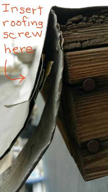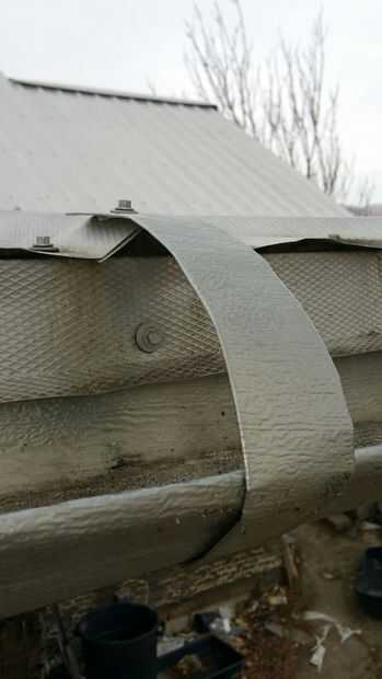 Ahora apriete el canal en forma de U en su forma final y subir la correa de apoyo alrededor de la canaleta e instale el otro tornillo de aluminio autoperforantes que penetra y protege la correa de apoyo y el techo. Asegúrese que la correa de apoyo se encuentra para que el extremo se conecta a uno de los picos en el techo de chapa como se ve en la foto 3.