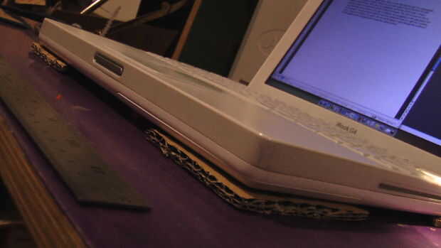 De esta idea se podría hacer una solución más permanente, aunque los materiales no son lo más accesibles de conseguir. Idealmente esto se haría de durable plástico corrugado. Luego la parte superior y parte inferior de las piezas pintado con caucho líquido. Así que esto puede realmente ser considerado un modelo funcional. Es un modelo simple pero aún casi la base de laptop más rápida, más portátil y desechable.
