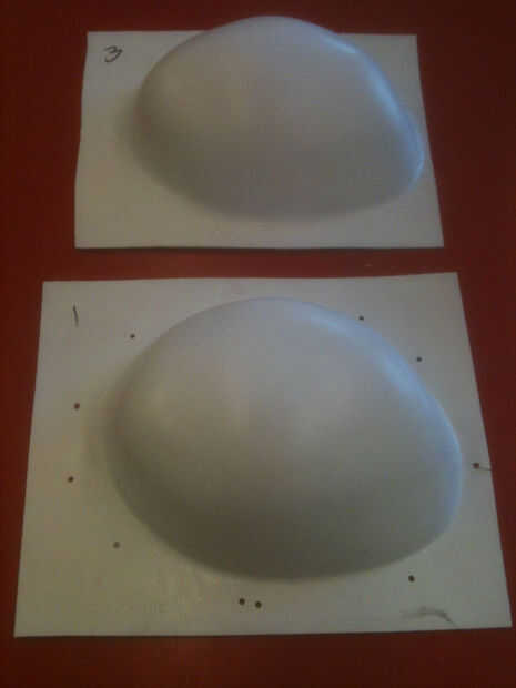 Éstos permiten un acabado relativamente en ambos lados del laminado sacarlo del molde. Fueron hechos sobre la cáscara en un pequeño vacío anteriores. Observe están marcados 1 y 3 - había formado 3 hojas de estireno uno encima del otro y quitar un medio para hacer espacio para el paño del cáñamo bio-derivados epoxi resina saturada. Los agujeros son para flujo de aire.
