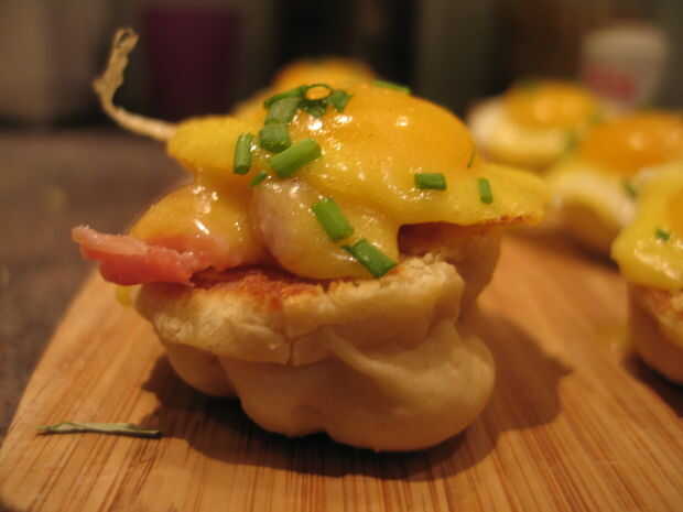 Por último usted realmente necesitará realmente hacerlas y reunir todos los ingredientes. Inicio de calentando una sartén y freír las mitades del bollo hasta obtener un color, esto no debería ser más de 30 segundos. Coloque su lado tostadas muffins arriba en orden ordenado en una tabla o placa, luego poner una pequeña cantidad de tocino encima de eso, luego los huevos de codorniz fritos luego sobre una cucharaditas digno de salsa holandesa, por último añadir algunas cebollino picado, sal y pimienta.