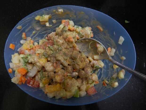-En un bol, añadir el pepino finamente picado, tomates sin semillas, patatas hervidas y picadas, cocido garbanzos, bellpepers y cebollas finamente picadas, zanahorias finamente picadas.