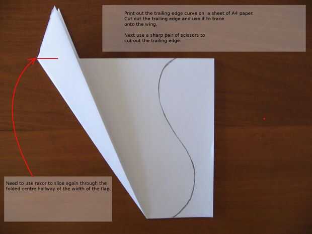 Ahora toma la plantilla de la curvatura de borde de salida previamente impresa y rastrear a las alas como se muestra. Luego corte a lo largo de la línea curva formando el borde de fuga. Para ello, sujete firmemente la hoja plegada y corte tan cerca de la curvatura como sea posible. Cuando abrió, llegar alas curvas idénticas en ambos lados.