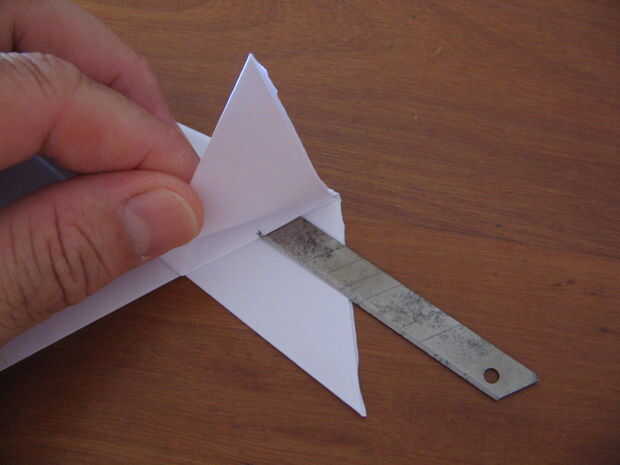 Ahora uso la maquinilla de afeitar y cortar el pliegue de centro como antes, pero esta vez sólo la mitad de la longitud como se muestra en rojo la línea en la foto anterior. Este corte permite 1 doblez final a la vanguardia, también endurece las alas y da la relación de aspecto correcta.
