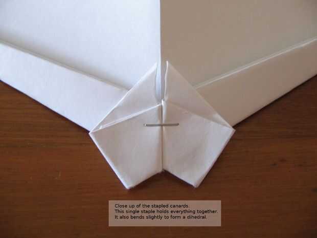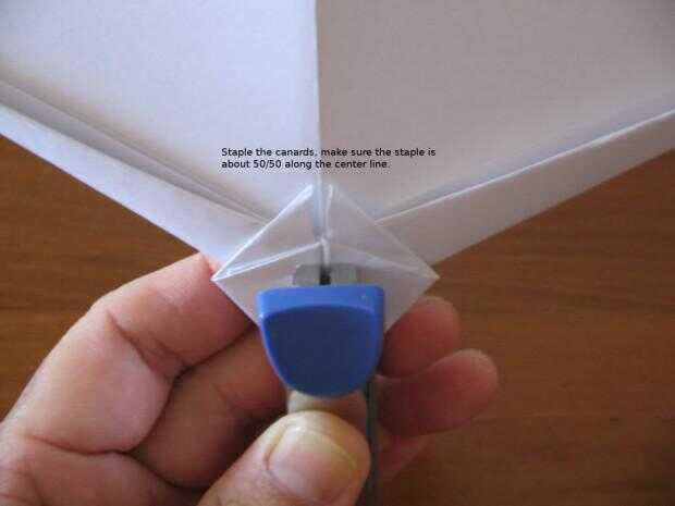 Luego Alinee cuidadosamente las alas de extensión y canards grapa central, una vez en el doblez del centro.