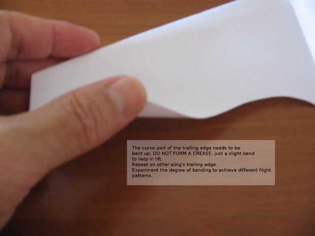 Doble ligeramente hacia arriba el borde de fuga. Esto crea una hoja que da la elevación de las alas.