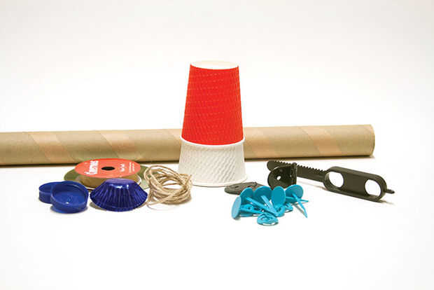 Para este proyecto se necesita un tubo de papel, tazas de papel, cadena, un CD del huso de la cinta o alguna cartulina, tapas y Makedo partes de mymakedo.com.