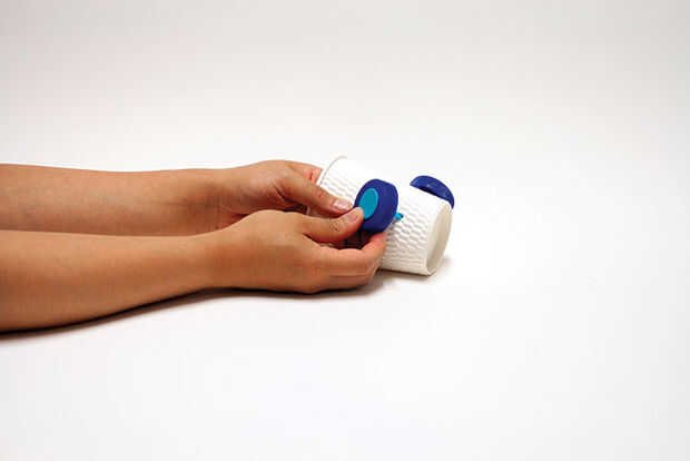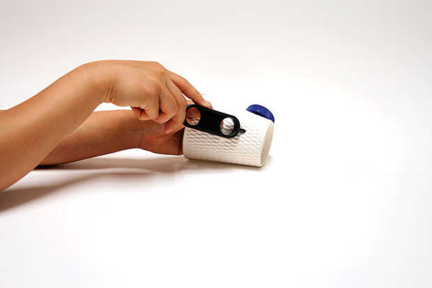 Ojos para tus peces, utilice el extremo del punto de la Sierra de segura Makedo y perforar un agujero a cada lado de la segunda Copa. Conecte las tapas los agujeros con Makedo volver a clips.