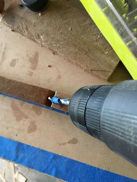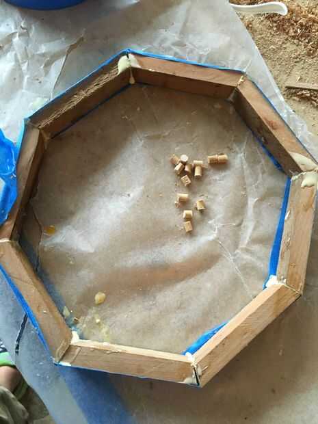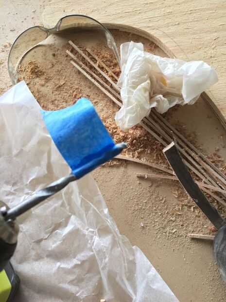 Tomé un pedazo de cinta de pintor y divididas en mitad de la distancia de la longitud de mis tacos entonces que para saber la profundidad le perforación en cada pieza de borde. después de prueba de montaje todo me extendió un pedazo de cinta y comenzó a unir las piezas junto con las espigas y pegamento entonces que sólo rueda la llanta haciendo que todas las uniones conexión correctamente y dejaron en mi papel de cera se seque.