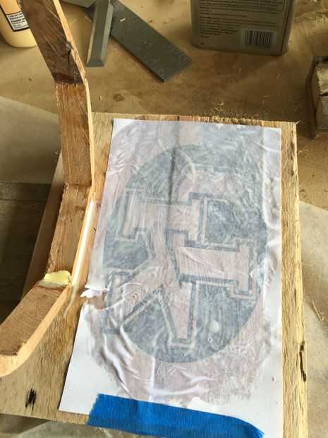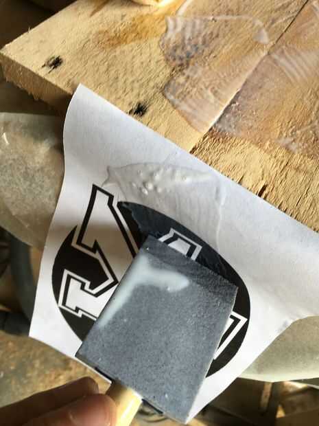 Primero tienes que pasar una cantidad justa de la pátina en la tabla donde desea que el logo sea, entonces teniendo una imagen impresa IN REVERSE (utilicé photoshop para invertirlo) poner la pátina en la imagen así. La cinta azul que ves ahí fue para hacerlo un poco más fácil alinear el logotipo en el tablero después de la pátina en el lugar.