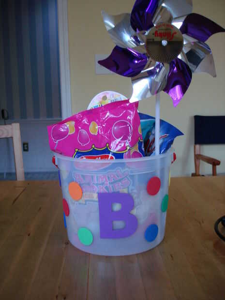 Llenar el cubo. Llené mis con una rueda pin, galletas de animalitos, chex mix y otras delicias.