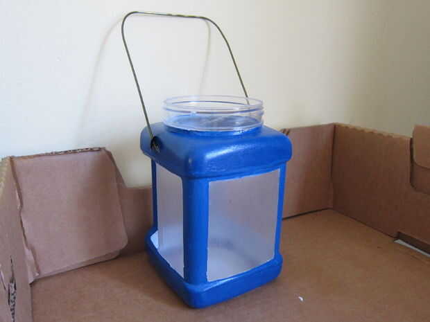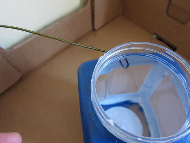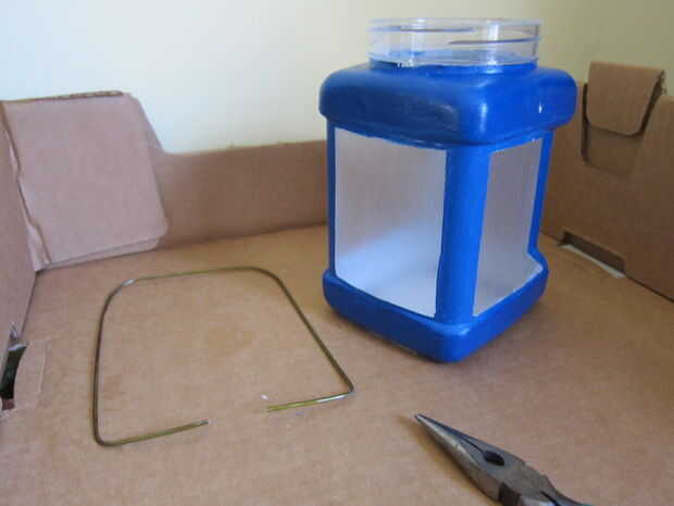 que utiliza una percha de alambre para el mango. Usando cortadores de alambre, corte la tutela de la percha y enderece el cable restante. El alambre para quitar la pintura de la arena. Doble el cable en una con fondo cuadrado "U" en una dimensión que se adapta a la mano. (Yo doblado una manija que es cerca de 4 pulgadas en la parte del mango, con 7 pulgadas "armas" a cada lado). La pulgada de la parte inferior de cada "brazo" en la curva para formar la parte del mango que se alimenta a través de los orificios a ambos lados de la parte superior de la linterna.