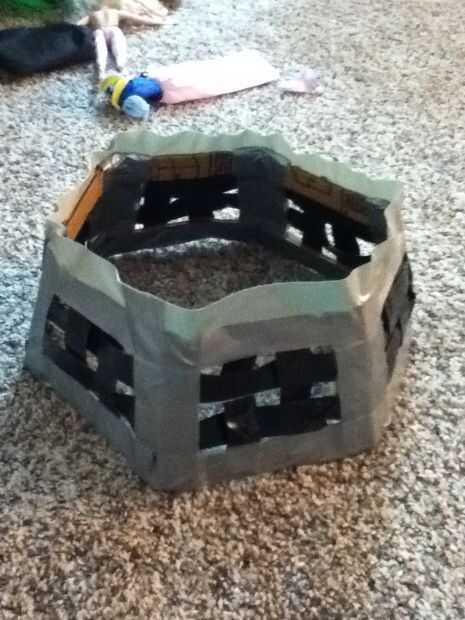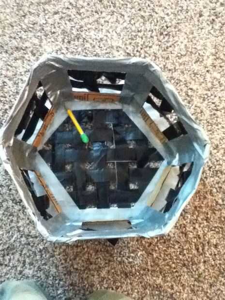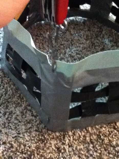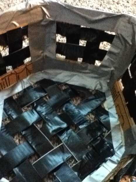En primer lugar, establecer el marco en la parte inferior de la cesta y utilice un lápiz para hacer abolladuras en las esquinas (ver imagen). Luego corte la parte inferior a ese tamaño. Ahora ponemos una tira de cinta adhesiva completamente alrededor de la base de la canasta, asegurándose de que las tiras de las paredes de la cinta en su lugar. Corte una abertura en la faja en cada una de las esquinas. Ahora con cinta adhesiva la parte inferior de la cesta como se muestra. Voltee la cesta y la parte inferior en la parte interior de cinta como se muestra. Su cesta ahora debería verse como la imagen.
