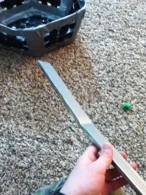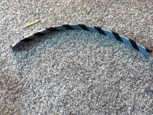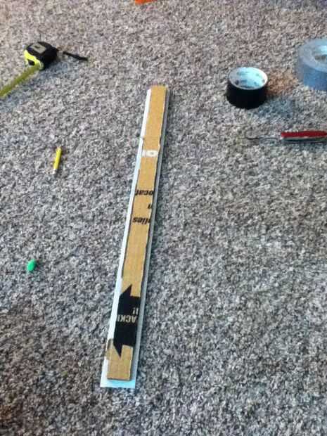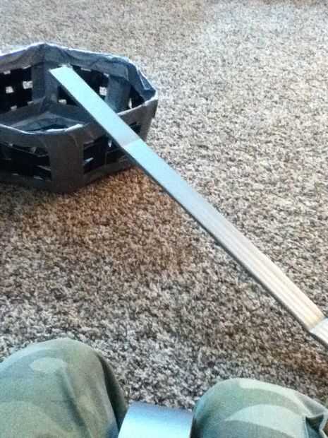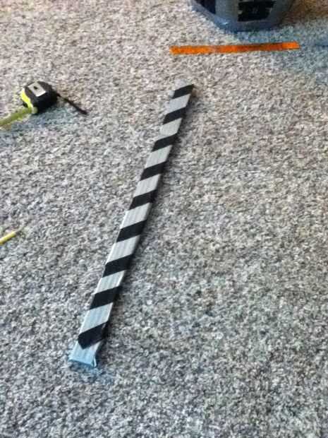 Ahora toma tus franjas de 25" y cubrir un lado con una tira de cinta adhesiva como se muestra. Ahora el otro lado de la cubierta y doble hacia abajo los bordes. Ahora corte el extremo de la cinta de color por la mitad y envuelva un lado alrededor de la manija como se muestra. Medio camino abajo de la manija, parar y utilizar el otro lado de la tira. Esto hará que tenga un final normal en su cinta del rodillo cuando termines. No debe haber ninguna arruga en el mango. Cuando termines, doblar el mango para que curvas como se muestra.