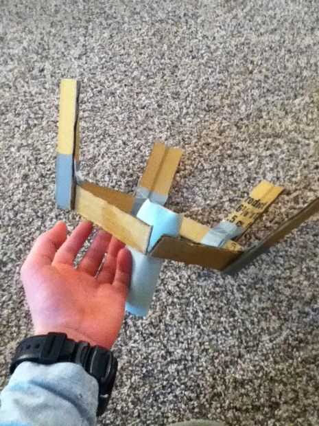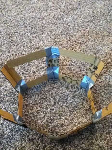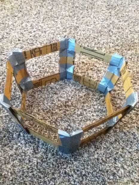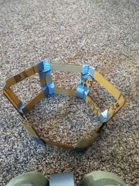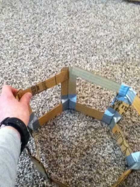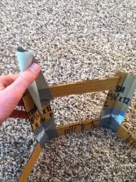 Ahora doble la pieza grande que ha hecho todo y la última pieza doblada sobre ella la cinta. Ahora tome un 1 "x 6" pieza y ponerla contra la parte superior de la frame(see picture) y memorizar el ángulo es en la parte superior de la frame(see picture). Ahora cinta adhesiva en la parte superior del marco. Cinta otro 1 "x 6" pieza en el cuadro junto a los otros piece(see picture). Ahora la cinta otro 1 "x 6" pieza en el marco de la misma manera. Lo mismo todo el camino alrededor del marco. El marco final debería verse como se muestra en la imagen.