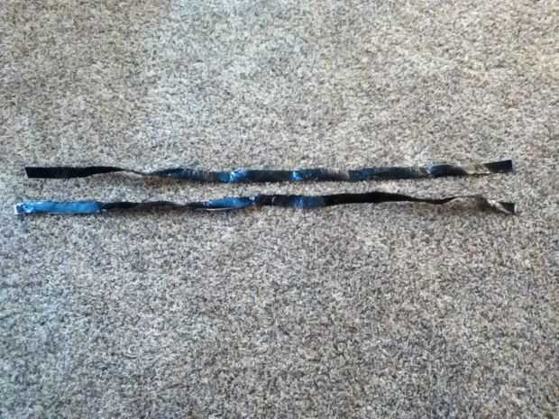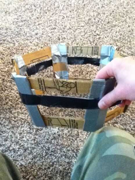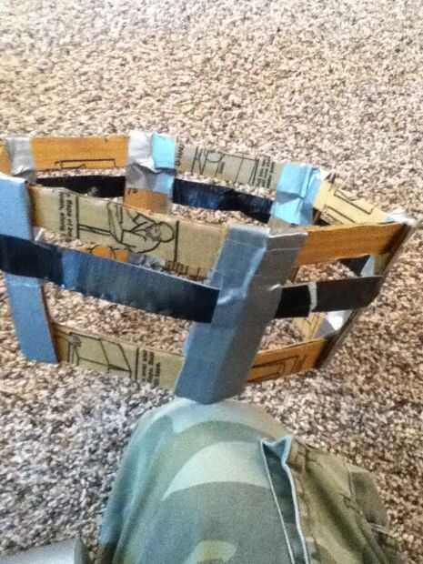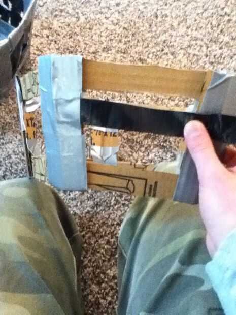 Ahora medir una tira de una cinta de diferente color que es 40" de largo. Cortarlo y doblarlo por la mitad. Pasa nada si tiene pequeñas arrugas, ya que es casi provocarle mantenerlo totalmente liso. Ahora hacen otra. Cinta el fin de una pieza doblada en el armazón, asegurándose de que sus cerca de 1/4" de la top(see picture). Manteniéndolo apretado, enróllelo alrededor de la estructura, manteniendo la misma distancia de la parte superior la manera entera alrededor. Luego tape el otro extremo en el chasis junto al primera final. Corte el sobrante. Ahora hacerlo de nuevo con la otra tira si conducto cinta excepto al lado de la parte inferior del marco. Ahora debería verse como la imagen.