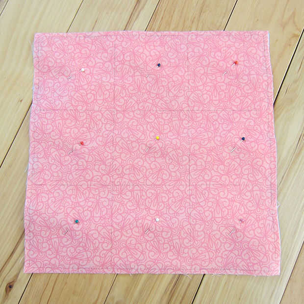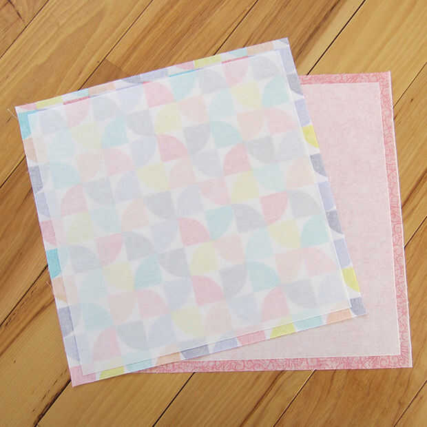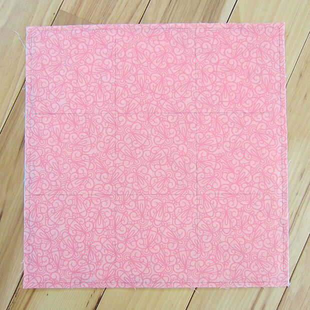 • Cortar dos cuadrados de entretela (utilicé Pellon 808 Craft-fusible Fusible Interface) que son de 12 por 12 pulgadas. Si usted está haciendo una cuenta de diverso tamaño para 1/4 pulgada a cada lado. Plancha la entretela al revés de cada pieza de tela, la entretela de centrado.