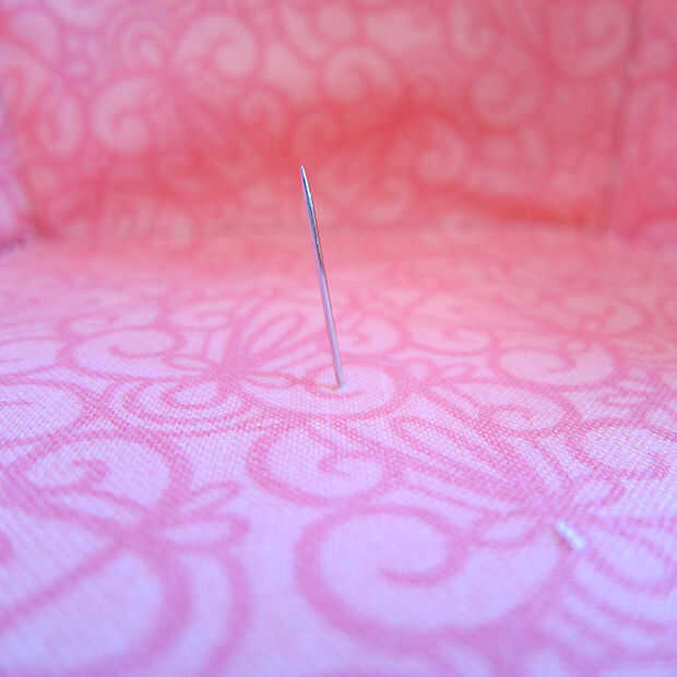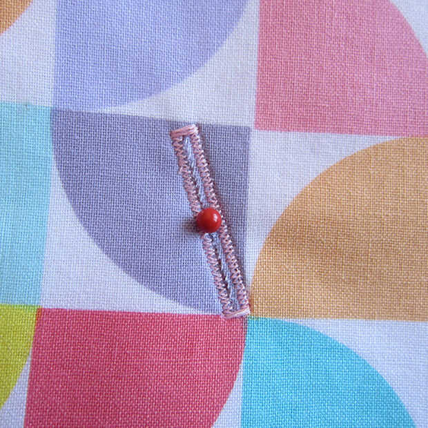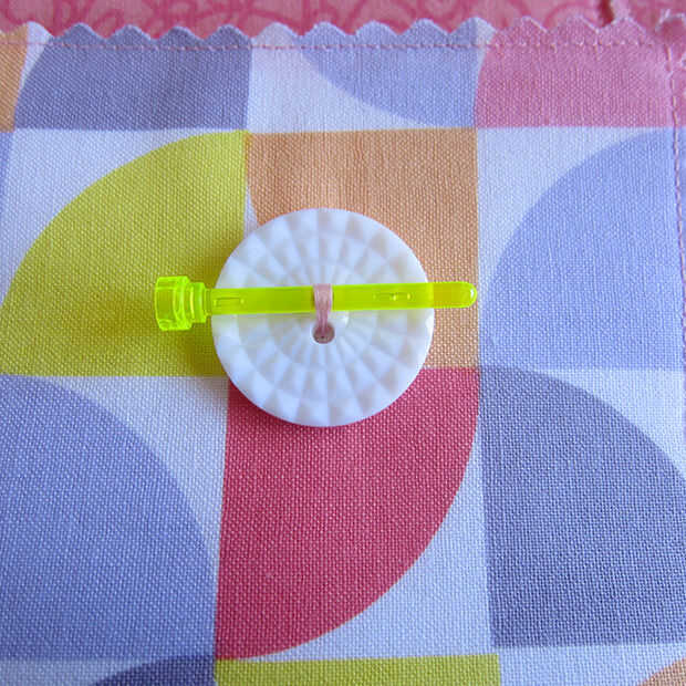 • Coser dos botones (ambos lados) con los ojales en el pin marcado puntos. Asegúrese de dejar suficiente holgura en el hilo de su botón para ir a través de tres capas de tela (cuenta para el mango que no hemos hecho todavía!). Mis hijos tienen literalmente miles de Legos así que agarré una espada para tener en cuenta las capas de tela. Si el hilo está demasiado apretado en el botón de la tela se agrupa y la cesta se verá deformada.